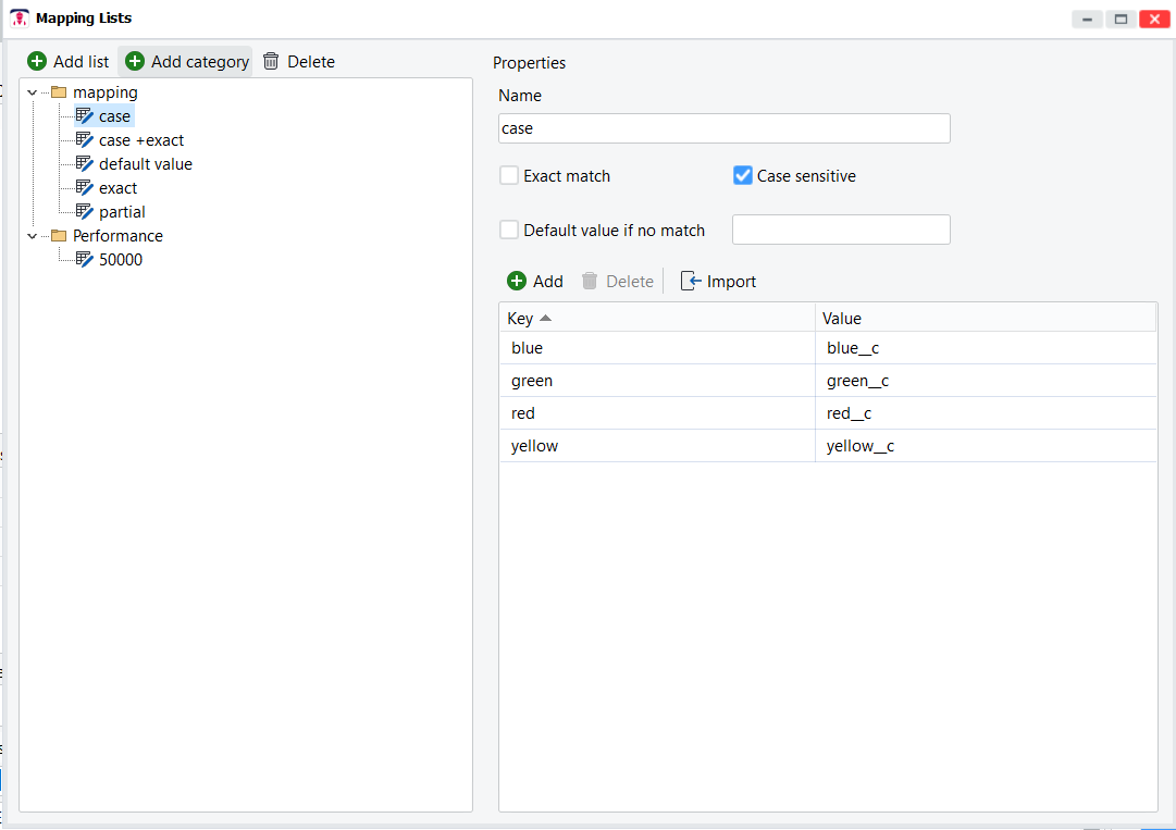 Checking **Case Sensitive** makes the mapping list match key values only if the case matches. Otherwise matches will be made regardless of case.
