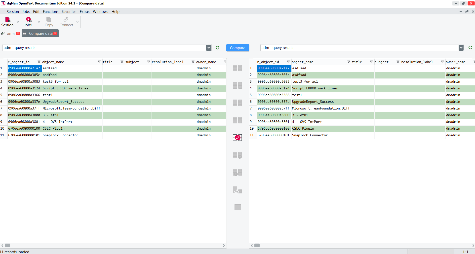 The Comparison Tool is a feature-rich utility designed to compare data from different sources, such as DQL query results, imported data lists, or clipboard data. This tool provides flexible options for comparing only the rows that differ between datasets, and it supports various combinations of comparison criteria.