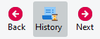 Clicking Back or Next loads the corresponding query into the input control, replacing the existing content. The History list displays all recorded commands.