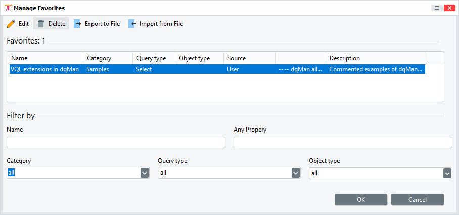 Favorites can be searched/filtered, using the various properties at the bottom of the window. Any property performs a full text search in all available properties. All queries that match the filter criteria are displayed in the center of the window.