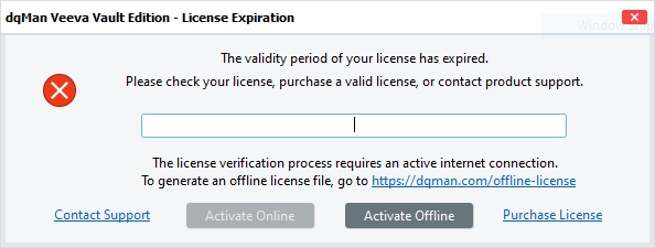 Either of theOnline License Activation orOffline License Activation methods described above can be used to reactivate dqMan with a valid license, after which the application will resume working normally.