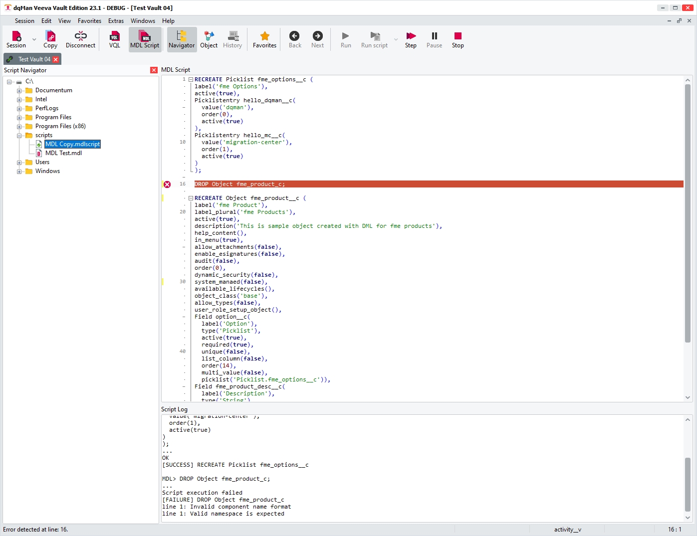 Load from file: Either use the Load Script action from the Edit main menu, the Script Navigator (folder tree) or drag-and-drop the file from your filesystem to the MDL view in dqMan Veeva Vault Edition.