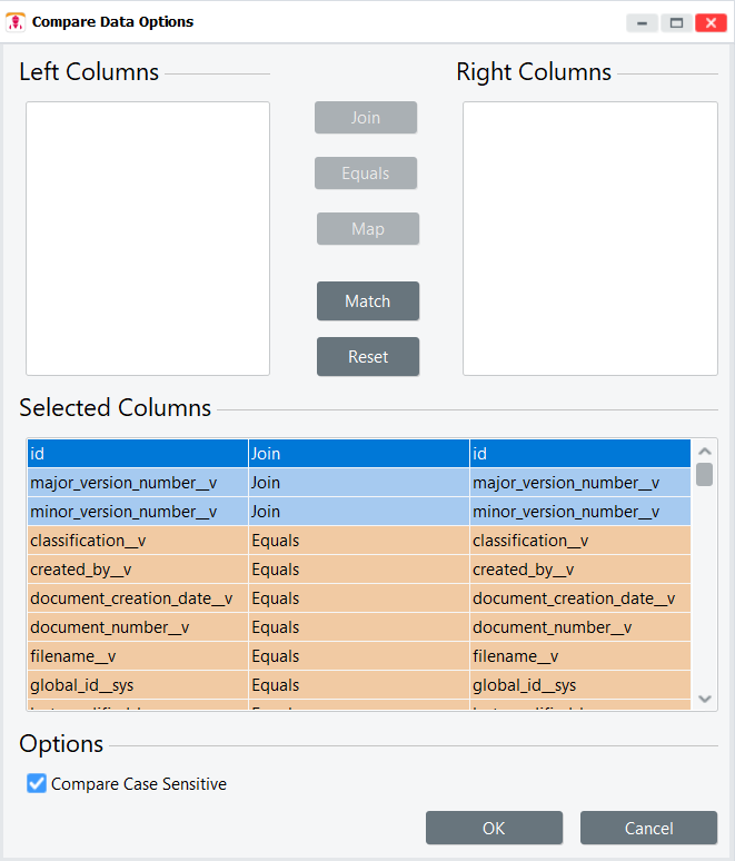 * The match button automatically performs the matching process for both the join operation and the columns earmarked for comparison, eliminating the need for user selection. Unnecessary columns can be excluded from the context menu before the comparison.