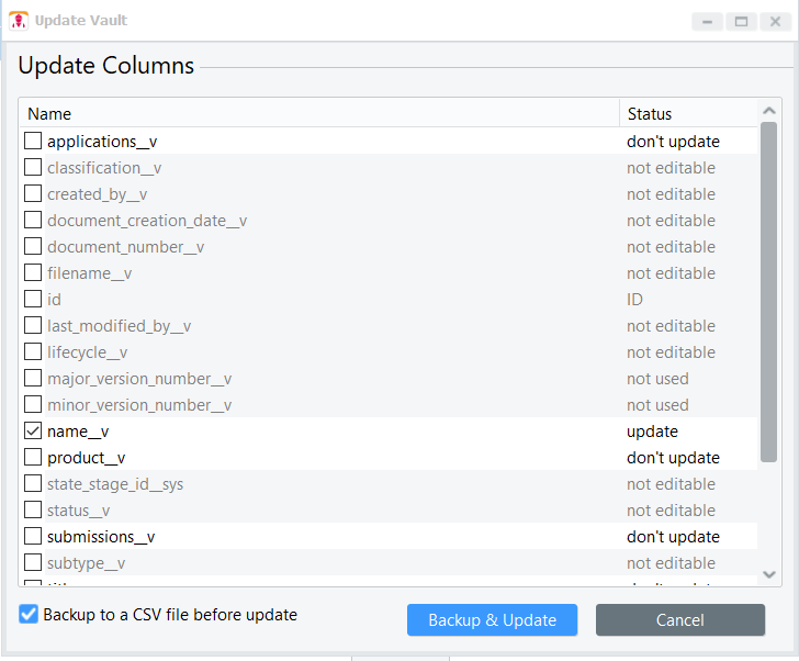 The updating procedure can be executed directly from the compare window by utilizing one of the designated update buttons. Within the update window, all columns are presented, with those necessitating updates marked with an "update" status. Additionally, users have the option to generate a backup file from this window, serving as a safeguard in the event a return to the initial values is desired. The system and read-only attribute are disabled and marked as "not editable"