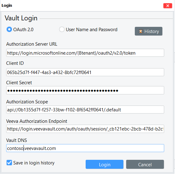 **To log in to a Veeva Vault**, start dqMan,  enter your login credentials and Vault URL. The URL protocol must not be specified since dqMan uses https to connect Veeva Vault. You can save your login credentials by selecting **Save in login history** and use them again in the future by clicking the **History** button.&#x20;